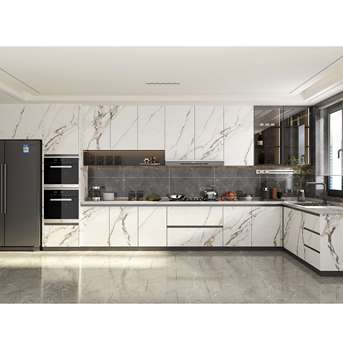 باب حجري أسود معاصر متكلس على شكل حرف L خزانات جزر وحدات تصميمات منزلية خزانة مطبخ ذكية حديثة
